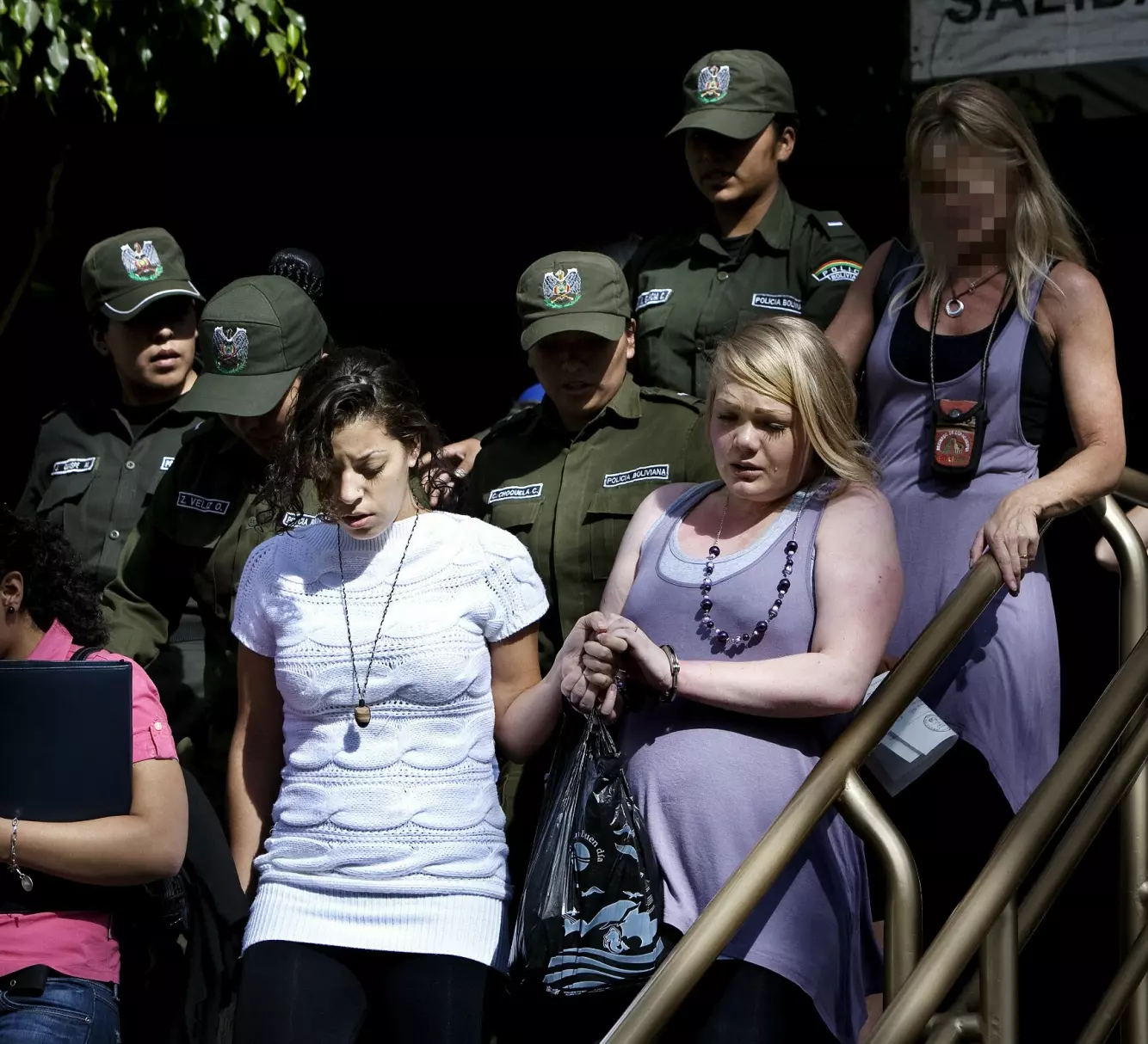 TÅRER: Madeleine Rodriguez (midten) og Stina Brendemo Hagen føres tilbake til fengselet etter domsavsigelsen i Cochabamba i 2010. Begge ble dømt til over 13 år i fengsel. Stinas mor i bakgrunnen er sladdet av Dagbladet. Foto: Henning Lillegård / Dagbladet.