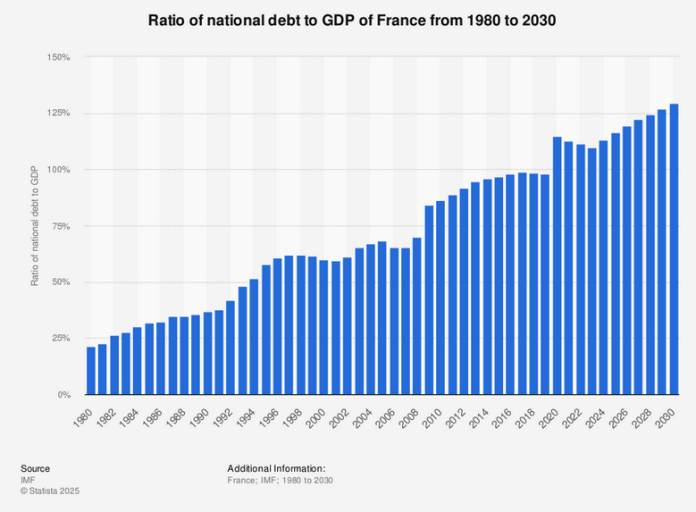 Denne grafen viser både den raske utviklinga av Frankrikes gjeld i forhold til BNP og hvordan gjeldskrisa i 2008 og covid-gjelden fra 2020 har slått ut.