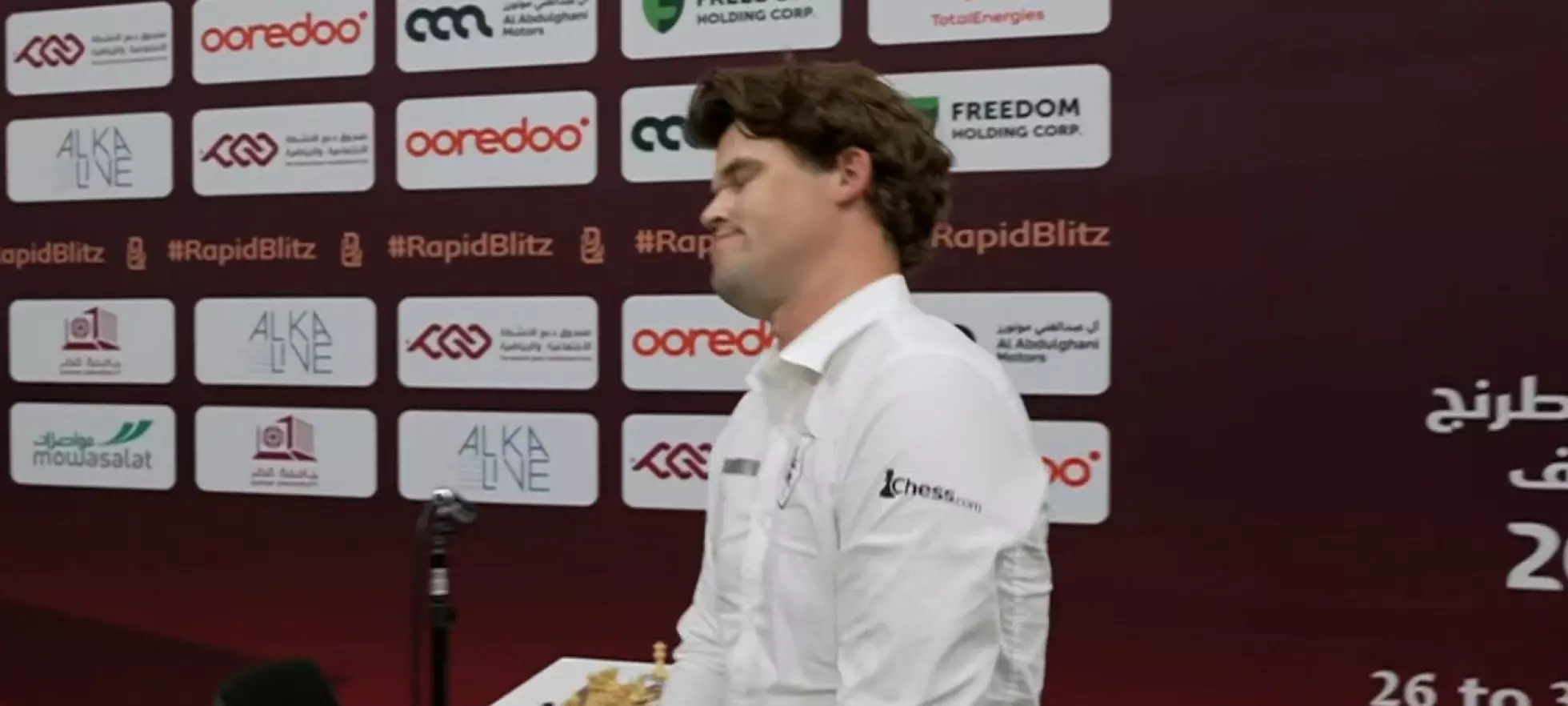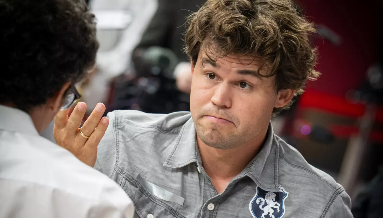 Magnus Carlsen (35) veltet brikke og tapte på tid – det første nederlaget i lynsjakk-VM. Video: NRK