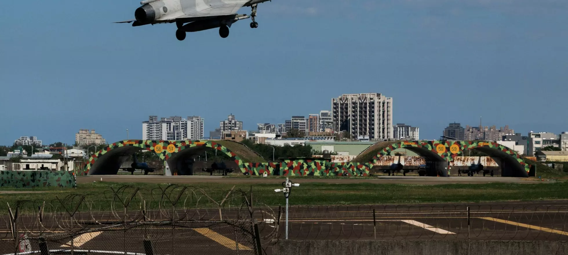 OVERVÅKER: Et taiwansk jagerfly på vei inn til landing på Hsinchu luftbase på øya tirsdag. Foto: Tsai Hsin-Han / Reuters / NTB