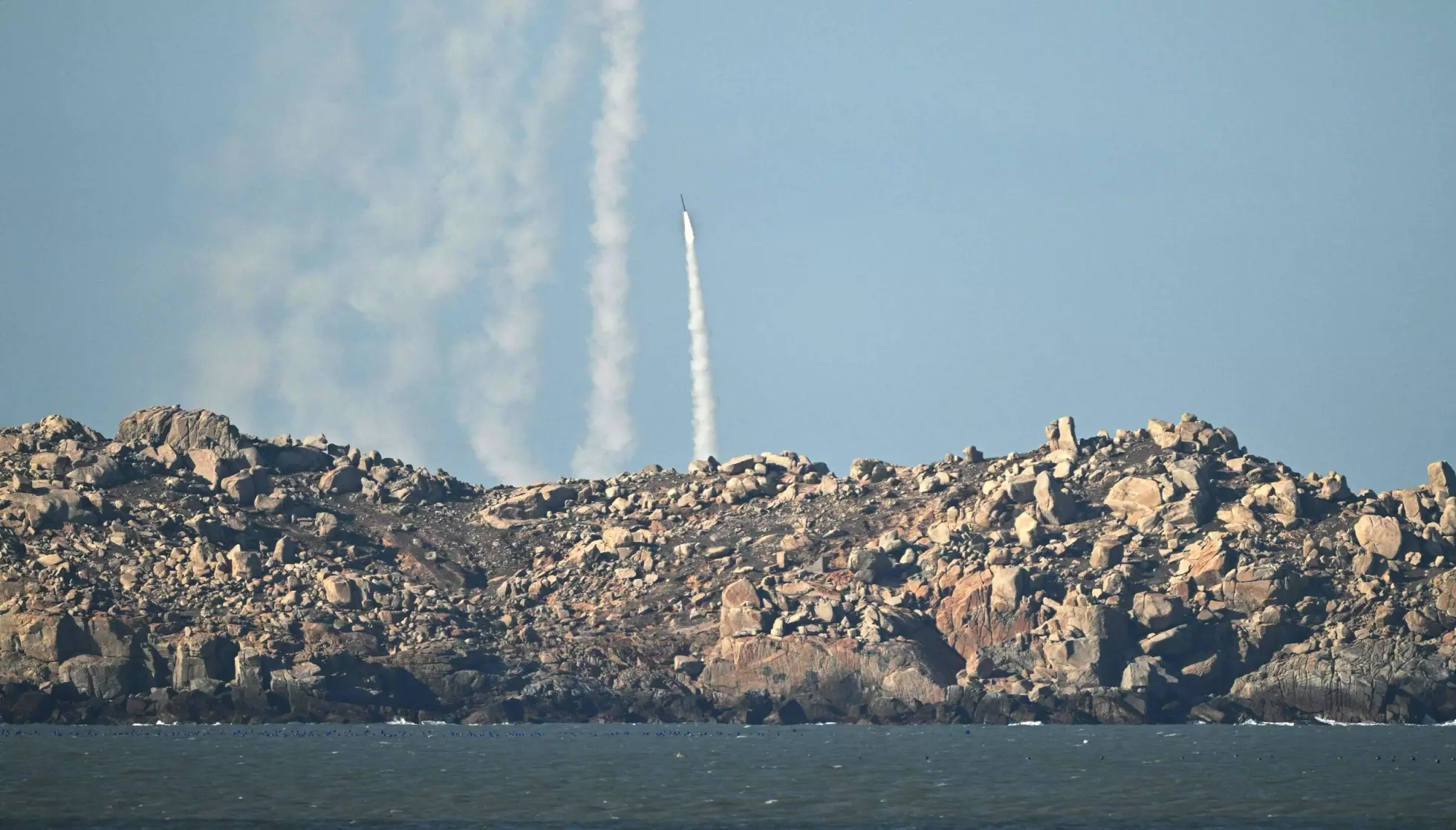 RAKETTOPPSKYTING: Kina skjøt opp raketter på øya Pingtan, øst i Kinas provins Fujian, punktet som ligger nærmest Taiwan. Foto: Adek Berry / AFP / NTB