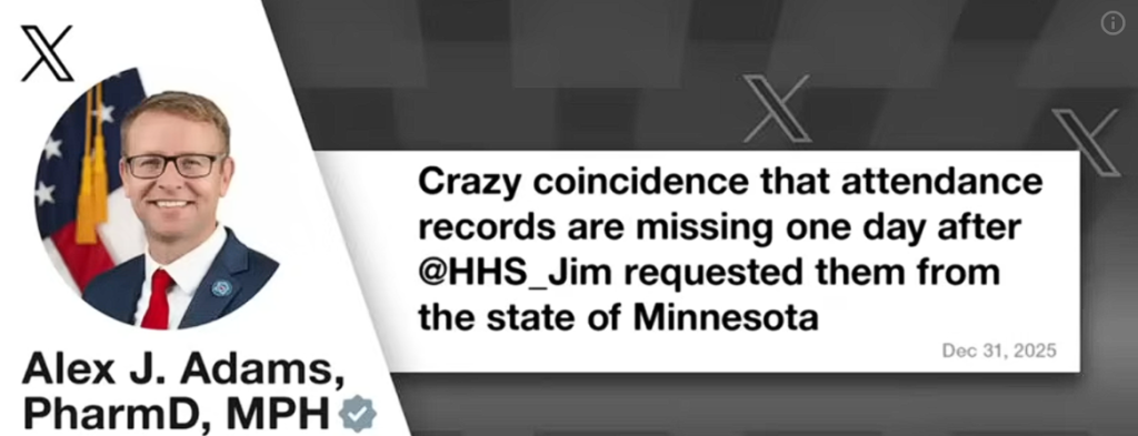 En tjenestemann i det amerikanske helsedepartementet (HHS), som denne uken stoppet føderal finansiering til barnehager i Minnesota, kommenterte saken på sosiale medier: «Merkelig tilfeldighet at fremmøtelister forsvinner én dag etter at HHS-sekretæren ba om dem fra delstaten Minnesota.»