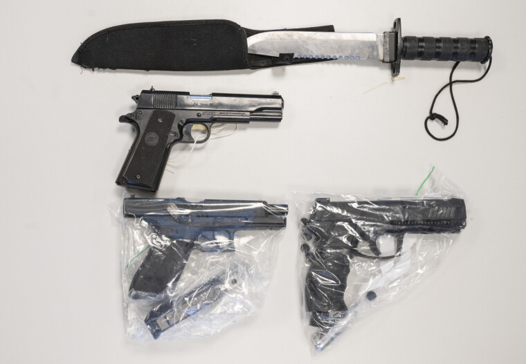 VÅPENBESLAG: – Det er spesielt at et barn kan være i besittelse av noe sånt, sier Erik Schau Ydstebø når han viser frem våpnene de har beslaglagt. I tillegg til kniven er dette softgun og gasspistoler.
