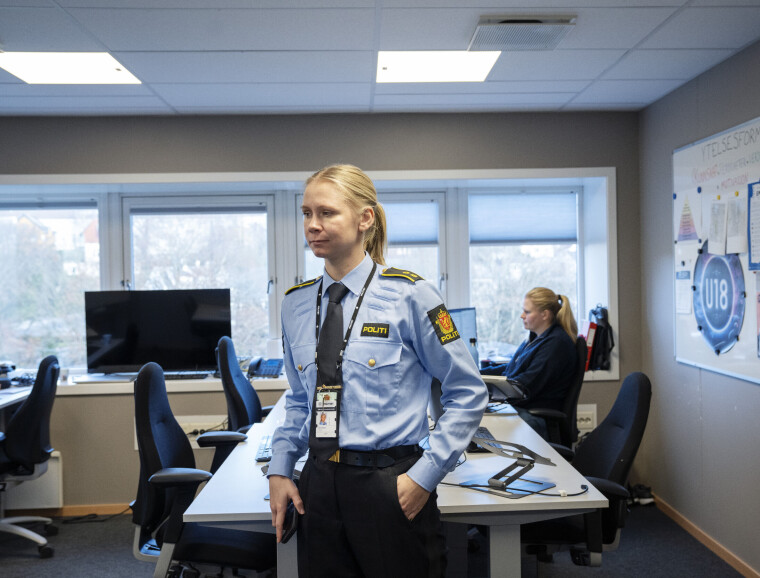 RIGGET FOR ØKT BEMANNING: Etterforskningsleder Linda Fjällstrøm Jakobsen (Stavanger) med U18-etterforsker Marit Christensen i bakgrunnen. På dette kontoret jobber U18, men ikke alle plassene er fylt opp. De har plass til flere folk.