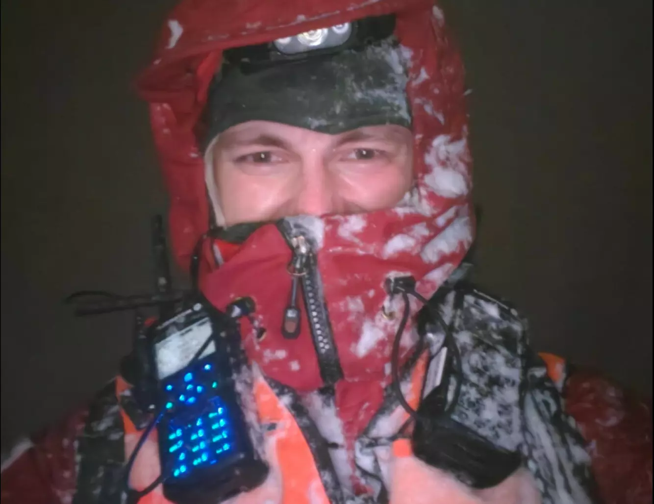 KALDT OG VÅTT: Frivillig Matias Høgden tilbrakte fjorårets siste timer i skikkelig ruskevær på Ulriken. Foto: Matias Høgden / Røde Kors