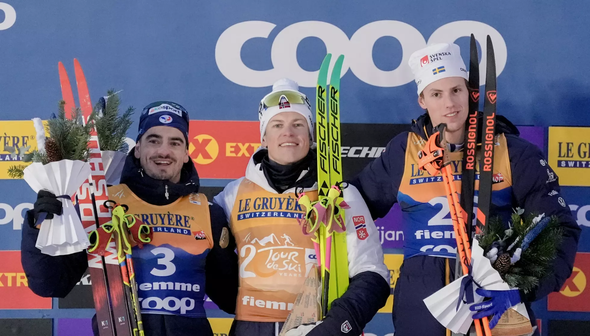 PALLEN: Norges Johannes Høsflot Klæbo tok førsteplass, Franske Jules Chappaz tok andreplass og Sveriges Anton Grahn tok tredjeplass i klassisk sprint finaler under Tour de ski i Val di Fiemme. Foto: Terje Pedersen / NTB