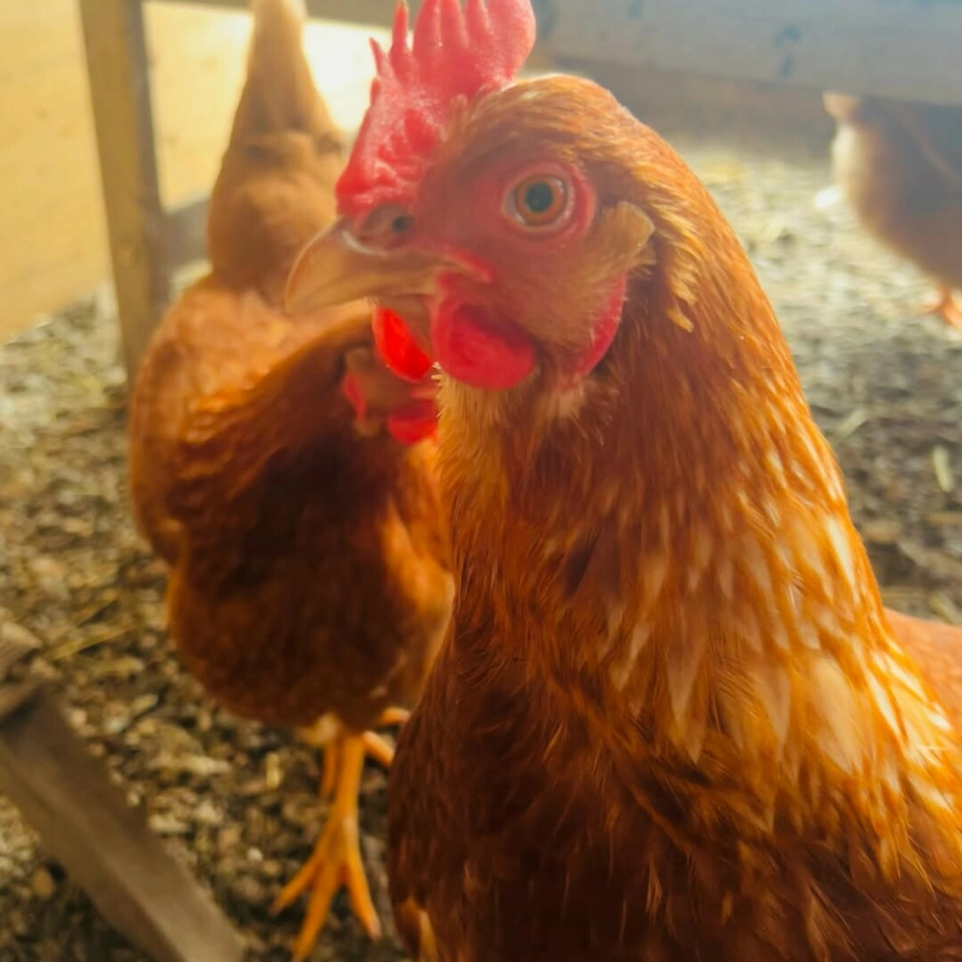 Her røper hun at en av hønene hennes hakket henne i øyet.