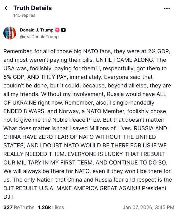 – Norge, et Nato-medlem, valgte tåpelig nok å ikke gi meg Nobels fredspris. Men det betyr ingenting! Det som betyr noe, er at jeg reddet millioner av liv, skrev Trump.