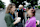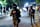 De marsjerer med alvorlig mine og blikket festet stivt foran seg, iført kamuflasjeuniform, skuddsikker vest, hjelm med visir og maskingevær.