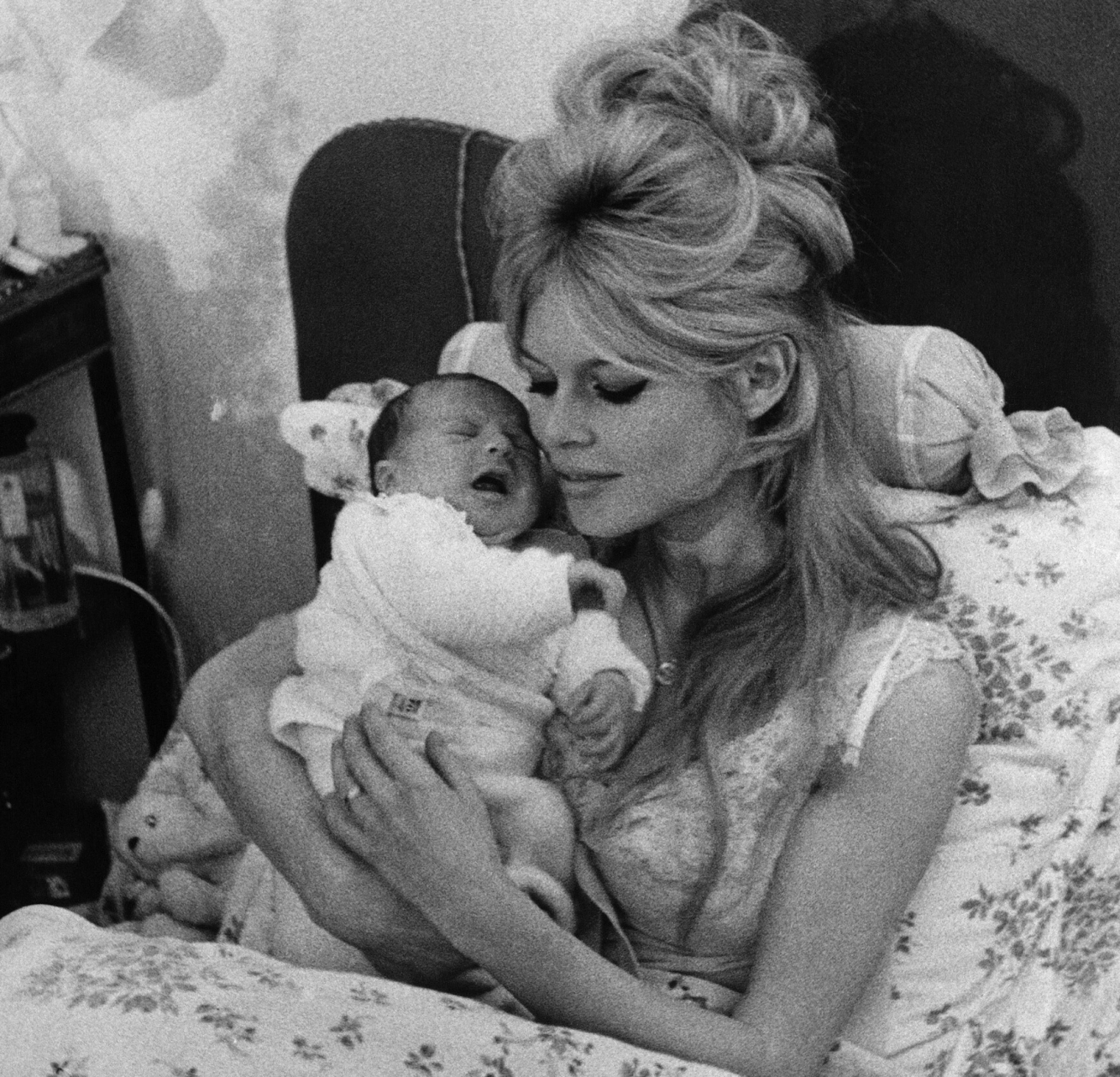 NYBAKT MAMMA: Brigitte Bardot holder sin nyfødte sønn Nicolas i leiligheten sin i Paris 13. januar 1960. Den 3,2 kilo tunge gutten, som ble født 11. januar 1960, er hennes eneste barn. Barnets far er skuespilleren Jacques Charrier. Foto: NTB