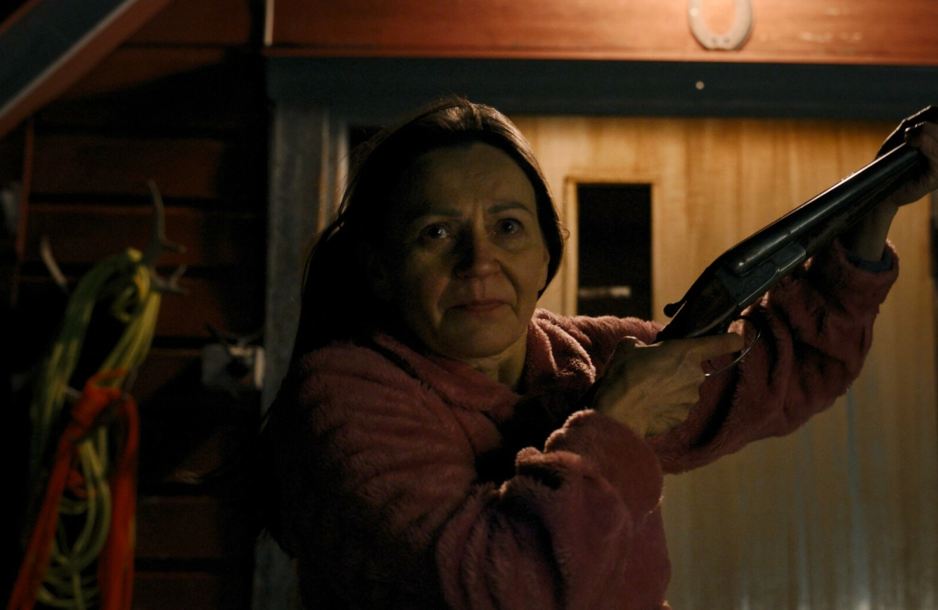 DRAMATISK: Det går tidvis vilt for seg i den samiske serien Heajastallan. Her griper rollefiguren Garen til hagla, spilt av Sara Margrethe Oskal. FOTO: Heajastallan produksjon/NRK