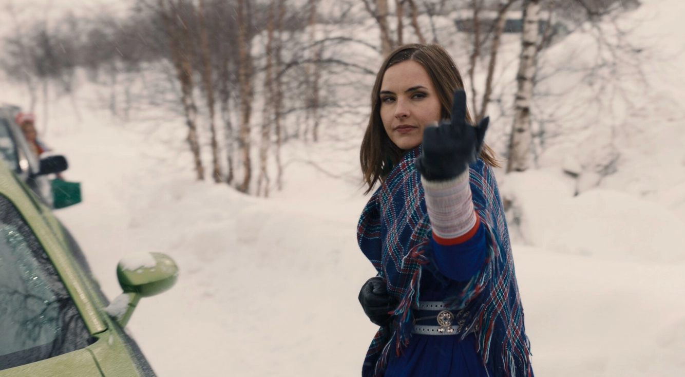 ALKOHOL: Inga Marja Utsis rollefigur sliter med alkohol i serien Heajastallan. FOTO: Heajastallan produksjon/NRK