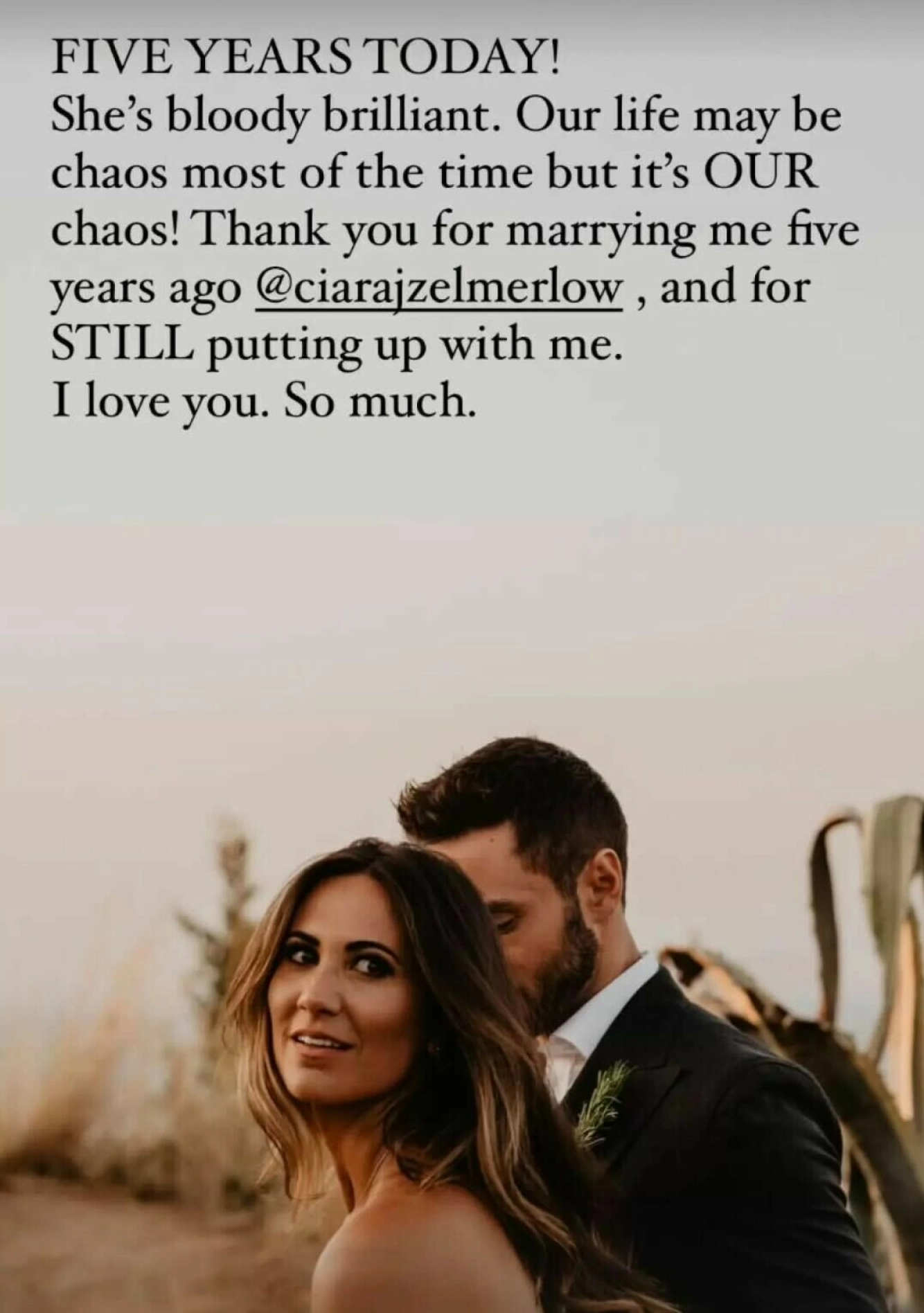 HYLLEST: Måns hyllet Ciara på bryllupsdagen. Lite visste de begge hva slags vending livet skulle ta. Foto: Skjermbilde: @Manszelmerlow / Instagram