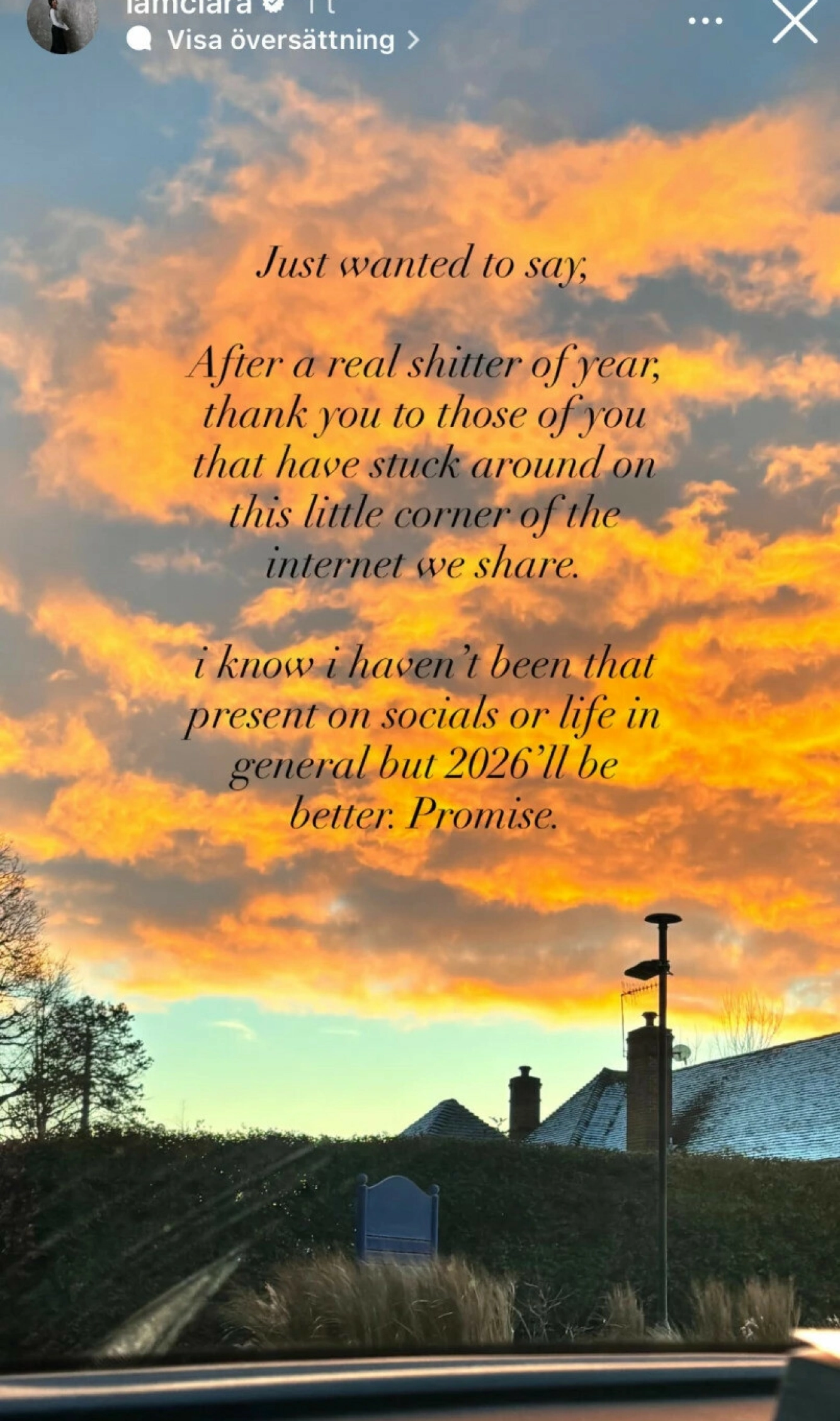 «Etter et skikkelig bedritent år – takk til dere som har blitt værende her, i denne lille kroken av internett som vi deler. Jeg vet at jeg ikke har vært så til stede, verken i sosiale medier eller i livet generelt, men 2026 skal bli bedre. Det lover jeg».