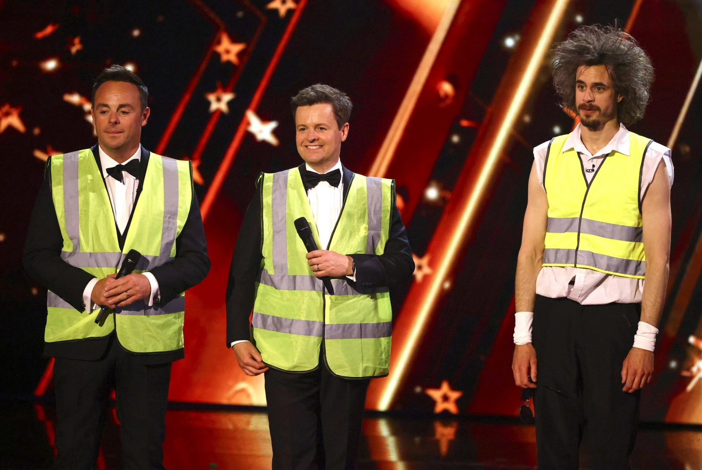 SKAPTE SHOW: Med sine lag på lag av refleksvester vant Viggo «Britain’s Got Talent» i 2023, og ble superstjerne. Her med programlederne Anthony McPartlin (50) og Declan Donnelly (50) – også kjent som Ant & Dec. Foto: NTB
