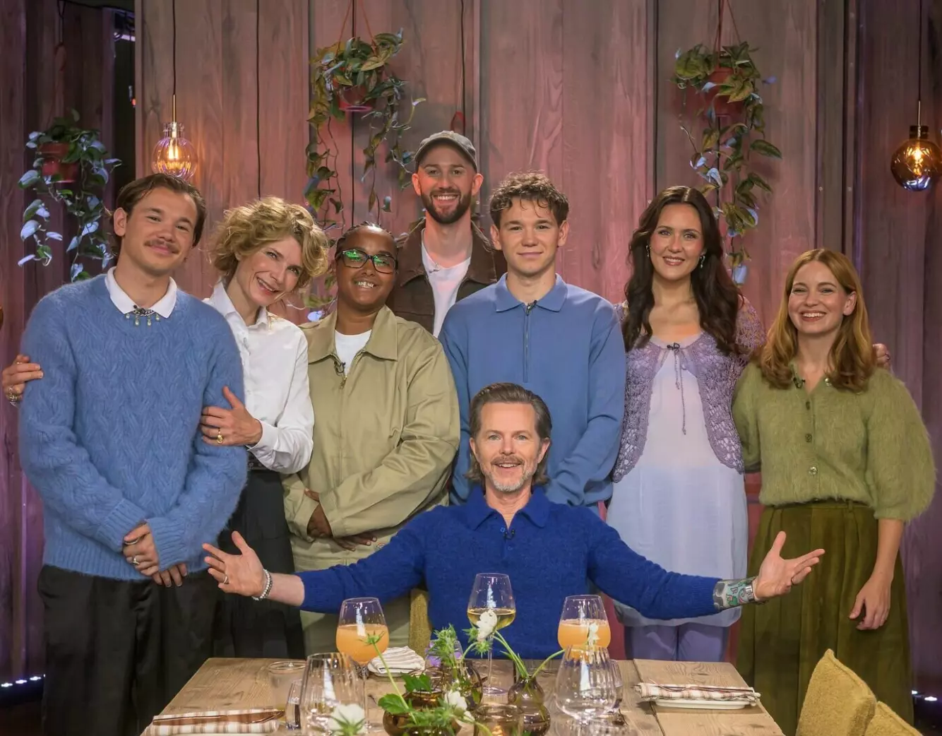 IKKE LIK LØNN: Blant årets «Hver gang vi møtes»-artister er det store forskjeller i både inntekt og formue. Bak f.v.: Espen Lind, Marcus Gunnarsen, Synne Vo, André Jensen, Herborg Kråkevik, Martinus Gunnarsen og Musti. Ukas hedersgjest, Marit Larsen, sitter foran. Foto: TV 2