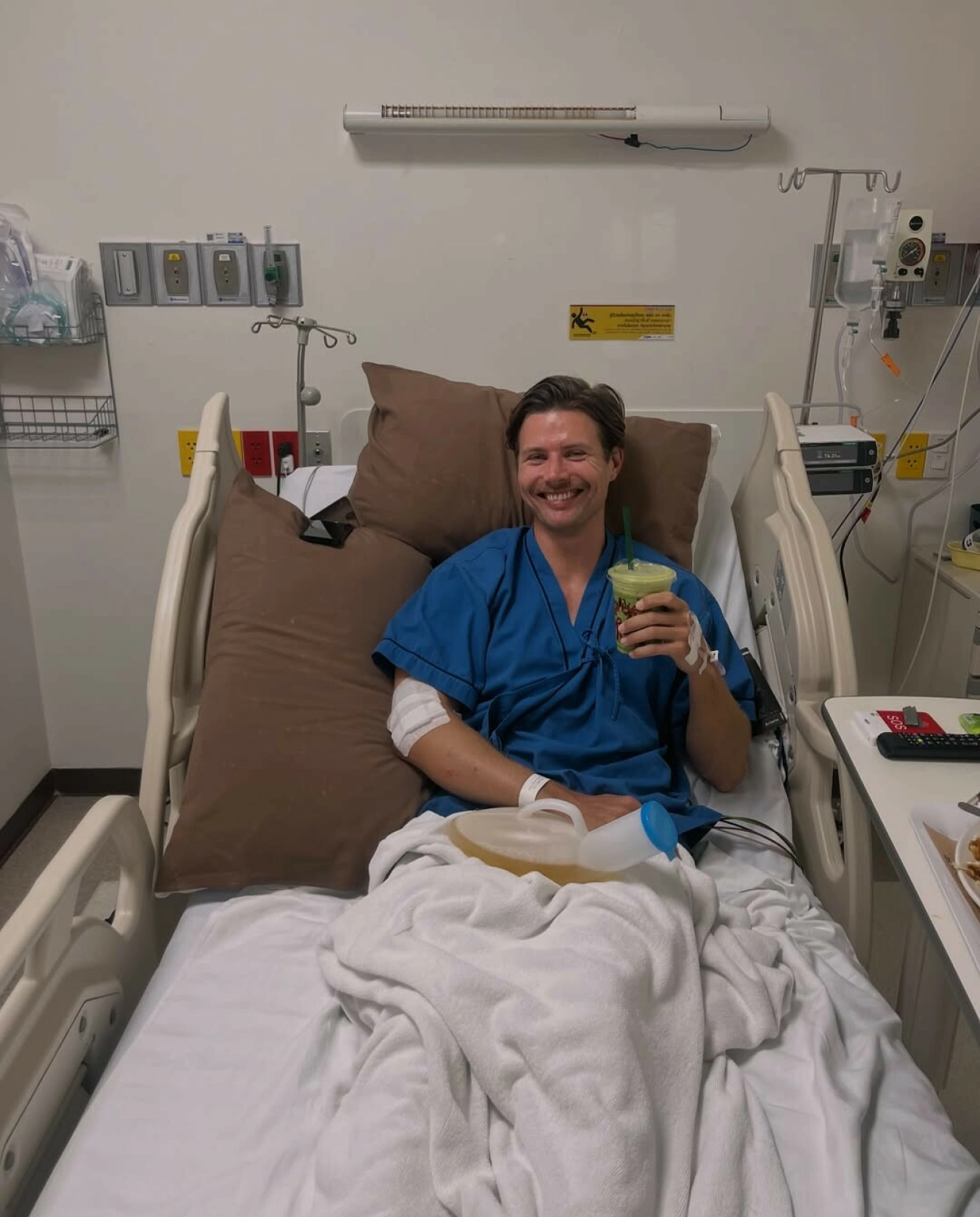 TATT HÅND OM: Erik Rydning ble tatt godt hånd om av helsepersonell, som forsikret at han ikke hadde fått alvorlige skader etter ulykken. Her sitter han smilende i sykehussenga med en smoothie. Foto: Instagram / @erikrydning
