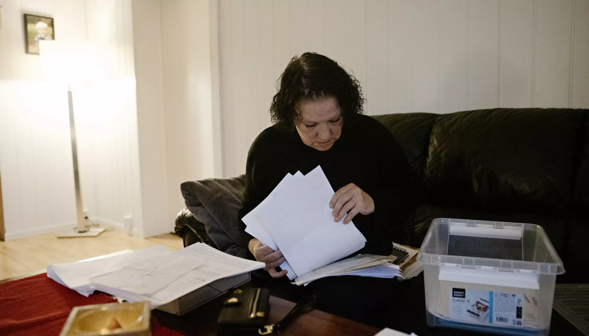 På bordet foran henne står en gjennomsiktig plastboks. Den er full av papirer: Politidokumenter, obduksjonsrapporter, brev fra strømselskapet, kontoutskrifter, notater – og en håndskrevet bønn fra faren hennes.