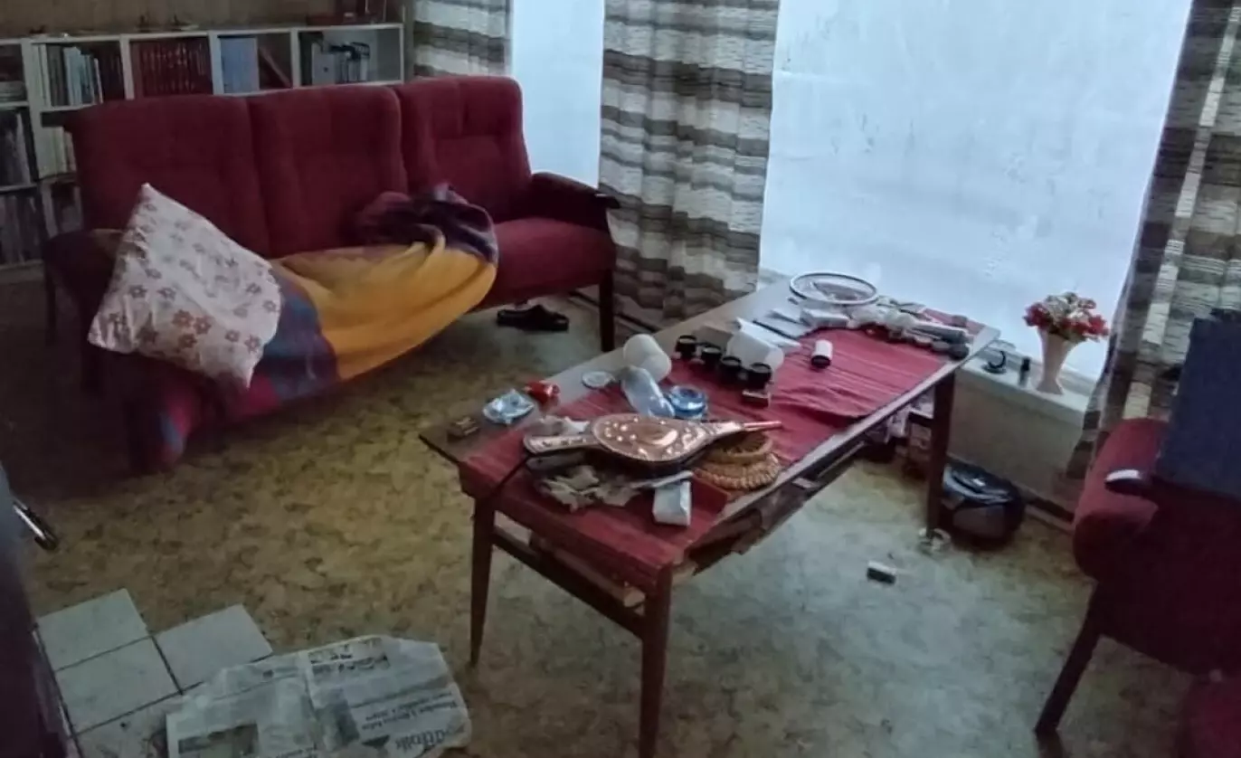 Inne er det is i taket, frosne møbler og vann som har stivnet på gulvet. Politiet har bedt henne ta på brodder.