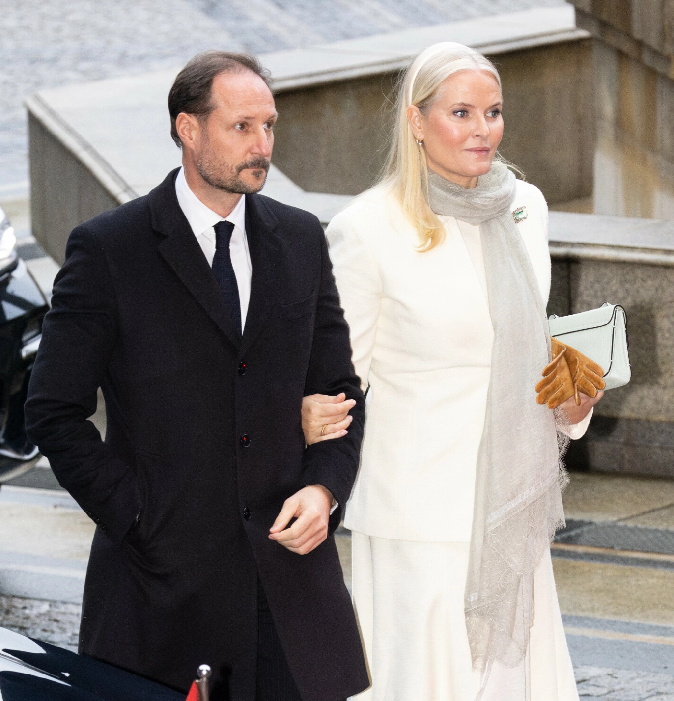 KLEDD I HVITT: Kronprins Haakon holdt galant Mette-Marits arm ved ankomst til Oslo rådhus. Foto: Andreas Fadum / Se og Hør