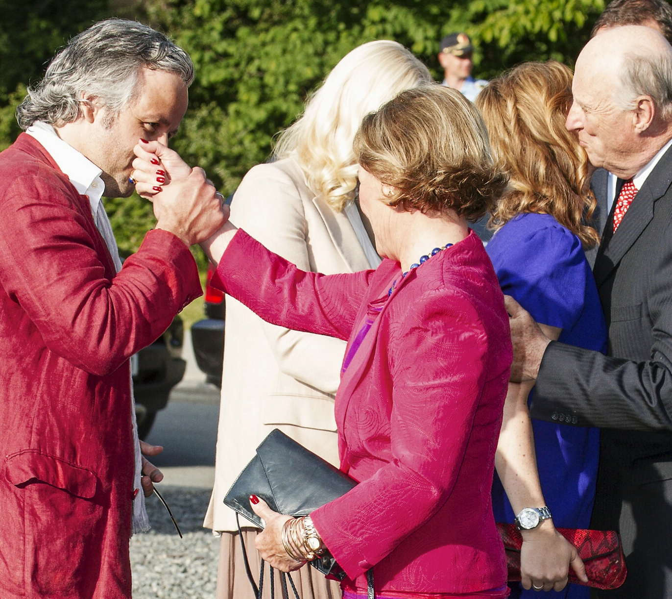 FORMELT: Den avdøde kunstneren Ari Behn kysset ofte svigermor Sonjas hånd. Bak ser vi kong Harald gir datteren et kyss på kinnet. Foto: Andreas Fadum / Se og Hør