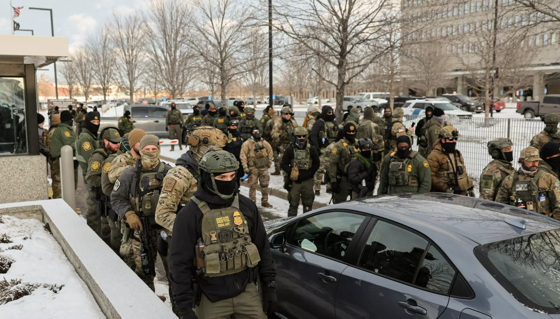 ICE-VAKT: Her står Immigration and Customs Enforcement (ICE) vakt utenfor Bishop Henry Whipple Federal Building under en demonstrasjon mot økt håndheving av innvandringsregler, i Minneapolis, Minnesota, USA, 10. januar 2026. Foto: Tyrone Siu/Reuters/NTB
