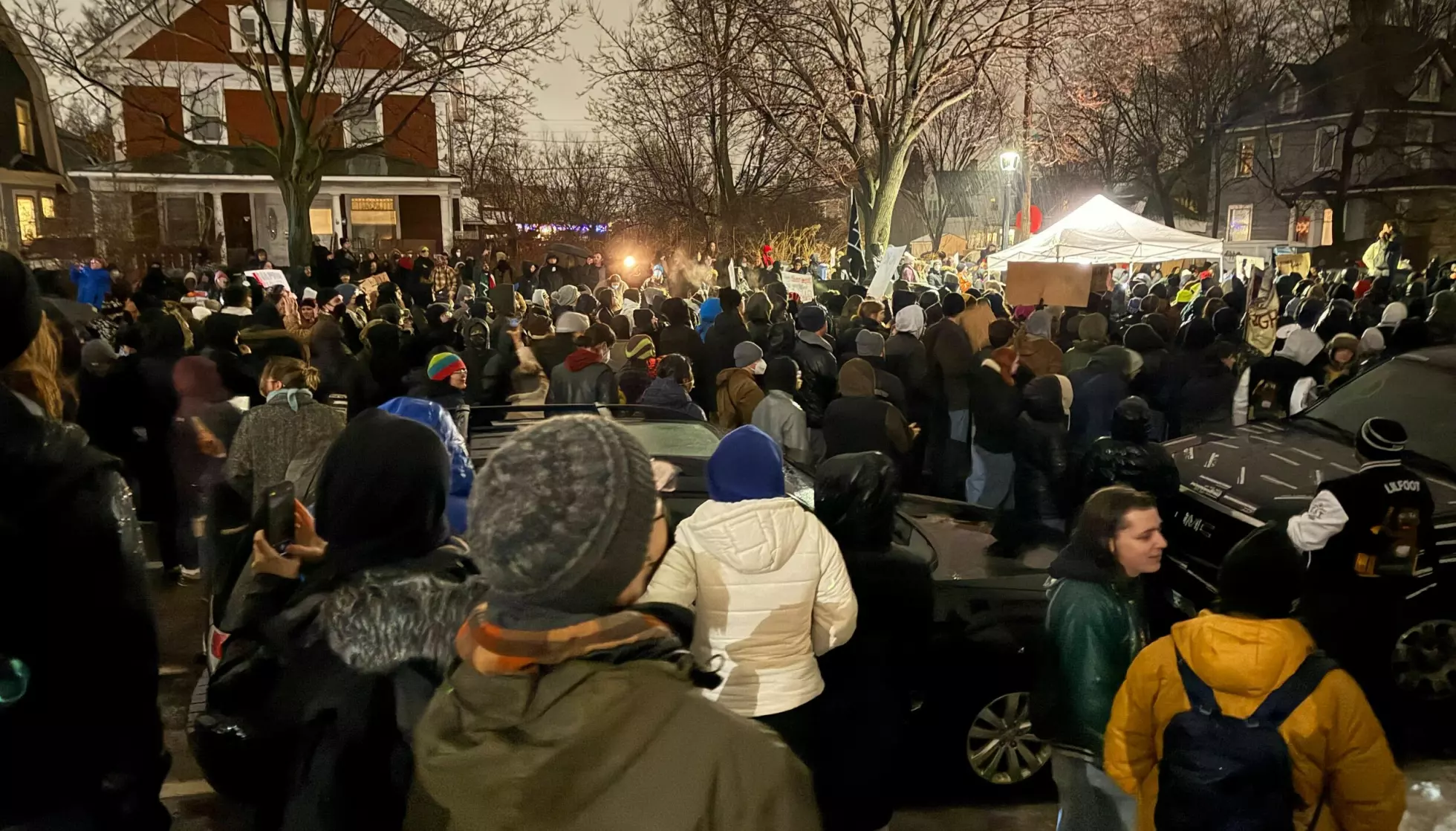 DEMONSTRASJON: Ting går foreløpig fredelig for seg, melder Dagbladets reporter i Minneapolis torsdag kveld. Foto: Vegard Kristiansen Kvaale / Dagbladet