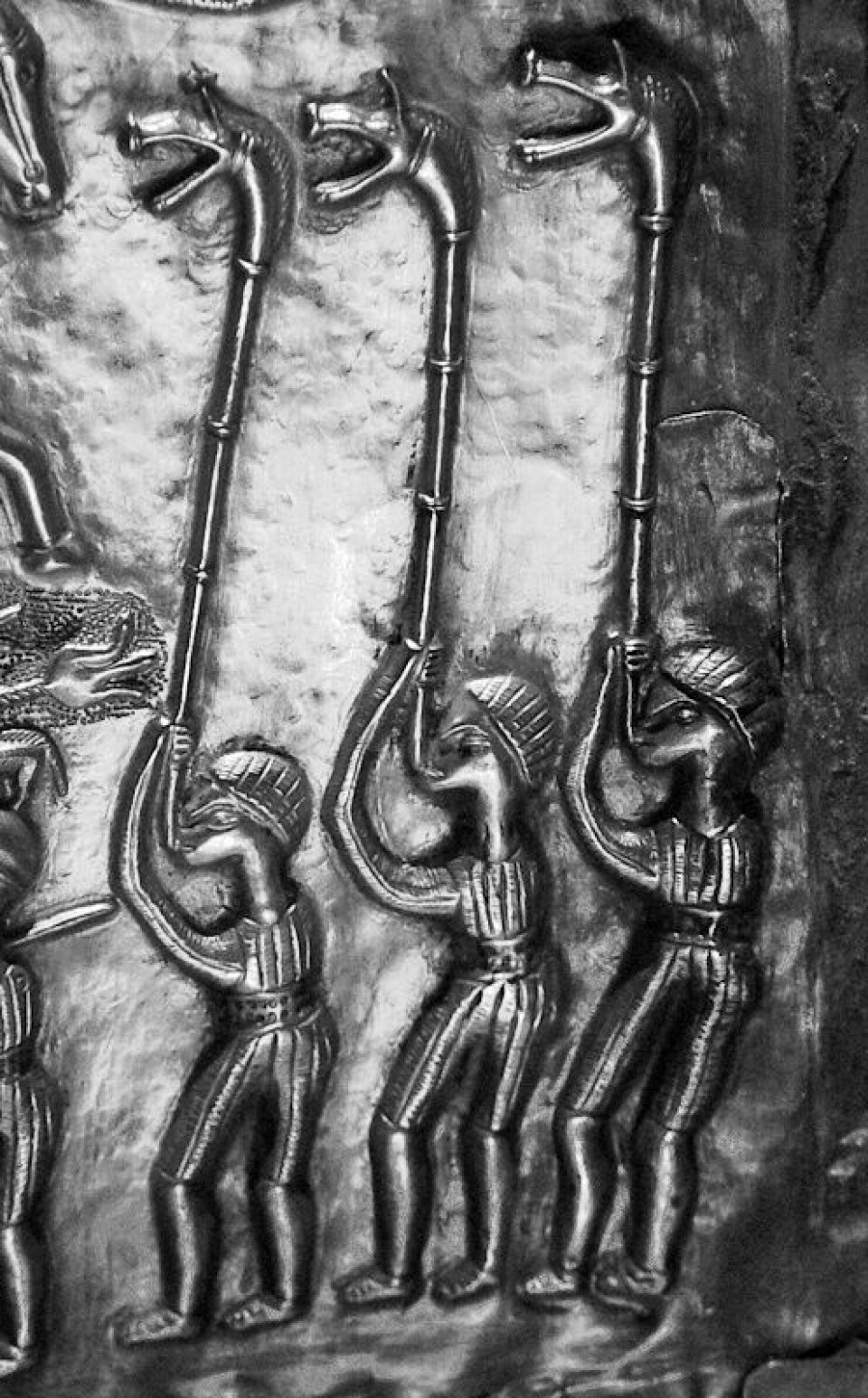 Avbildning av Carnyxer på den danske Gundestrupkjelen.