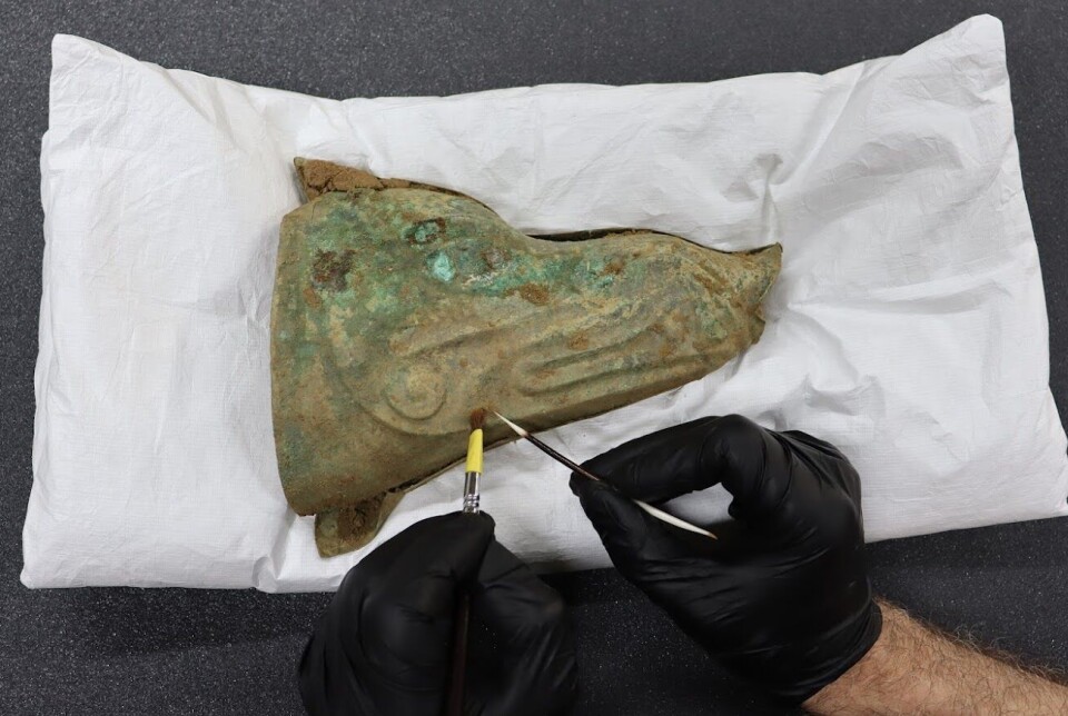 De har avdekket en samling med gjenstander fra jernalderen som inkluderer en svært godt bevart krigstrompet, eller carnyx, i bronse og et krigsbanner i form av et villsvinhode.