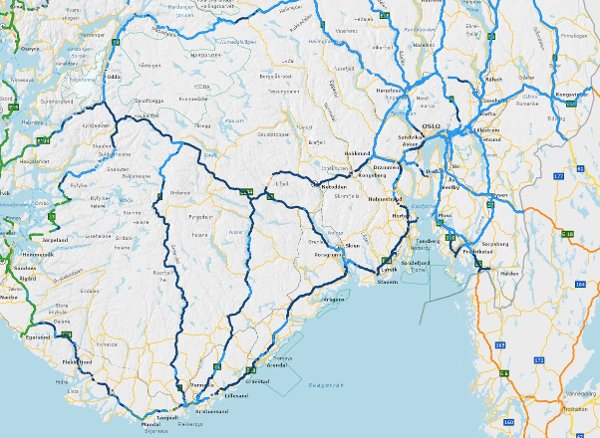 GLATTE VEIER: De lyseblå strekene viser høy risiko, mørkeblå svært høy.