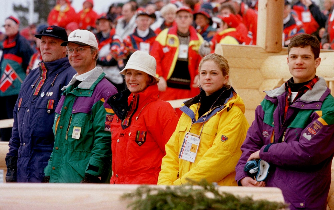 1997: Deler av den svenske kongefamilien var tilstede i regnet på Granåsen under ski-VM sammen med sitt norske vertskap. Bildet viser fra venstre kong Harald, kong Carl Gustaf, dronning Sonja, prinsesse Madeleine og prins Carl Philip. Foto: Rune Petter Ness/NTB