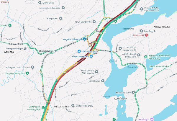 E18 inn mot Oslo er helt blokkert på grunn av hendelsen. Politiet skriver at det er omkjøring via Billingstadsletta, men også her er det nærmest full stopp i trafikken.