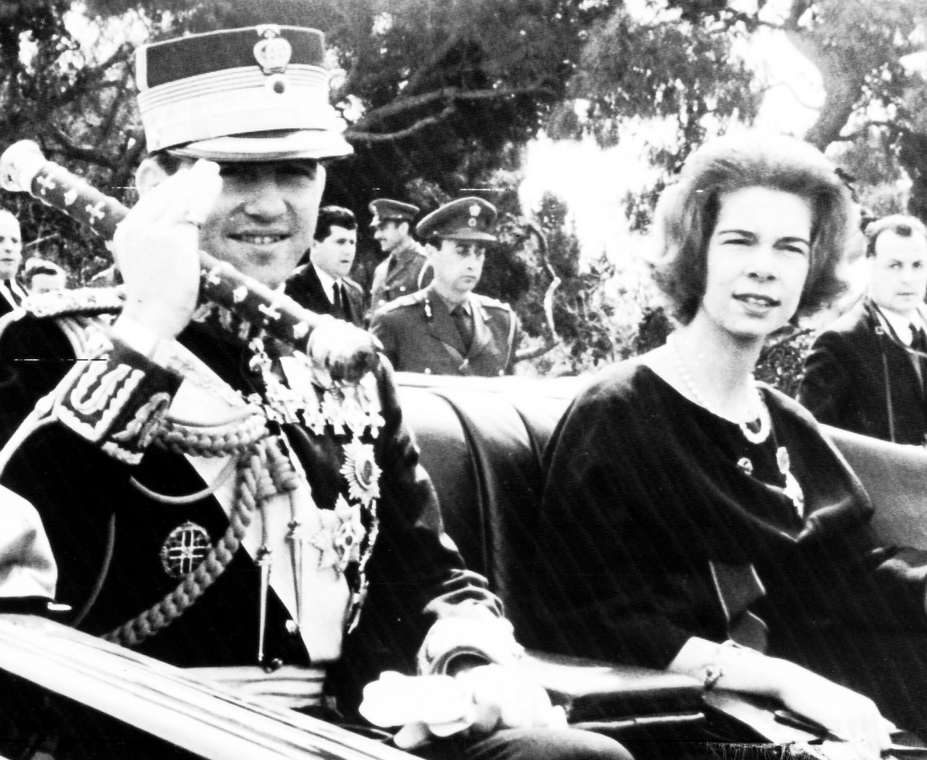 1964: Kong Konstantin Constantine av Hellas med septeret i hånden på vei hjem fra det greske parlamentet. Ved siden av sitter søsteren prinsesse Irene. Foto: NTB