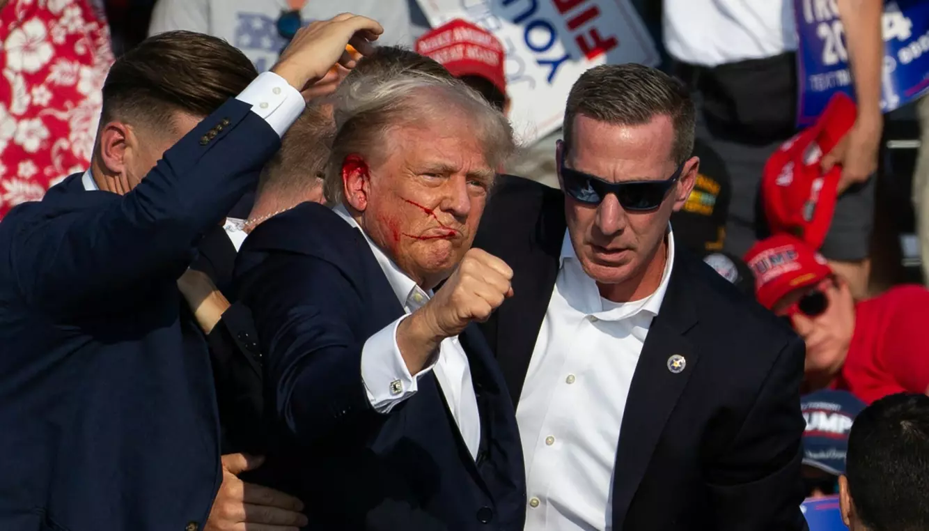 SKUTT I ØRET: En blodig Trump ble evakuert fra valgmøtet i Butler i Pennsylvania i 2024, etter at en kule streifet hodet hans og traff ham i øreflippen. Foto: Rebecca Droke / AFP / NTB