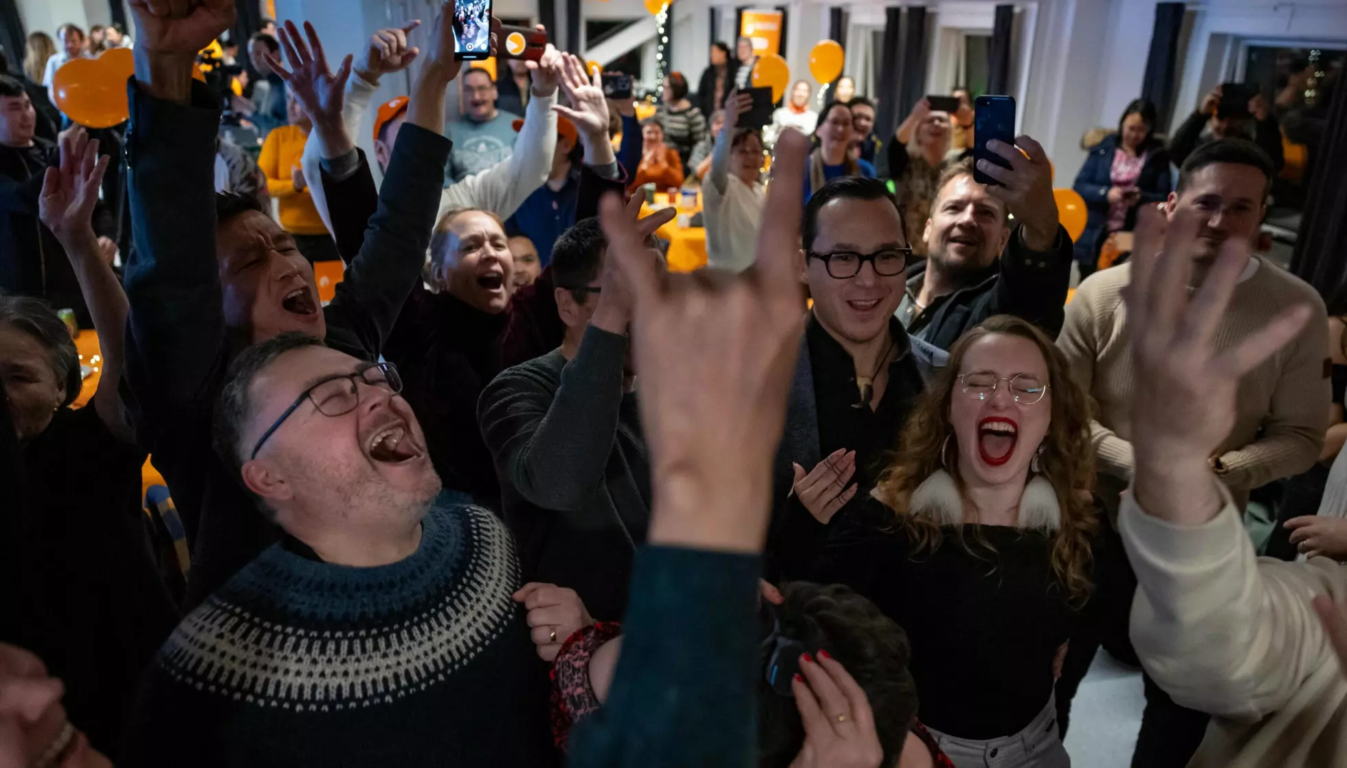 JUBEL: Pele Broberg og partifellene feirer valgresultatet i mars i fjor. Foto: Odd ANDERSEN / AFP / NTB