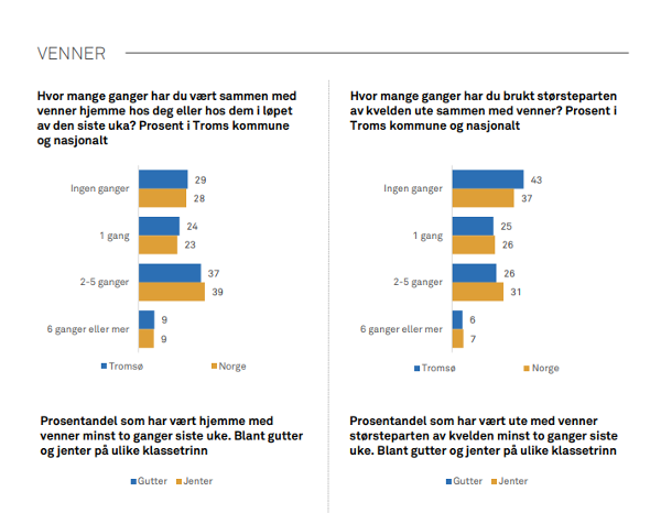 At barna er mye alene på rommene sine fremgår av den siste nasjonale Ungdata-undersøkelsen på ungdomstrinnet. I Tromsø oppgir nesten én av tre at de ikke har hatt besøk av venner eller vært hos venner i hjemmet siste uka. Like mange oppgir at det har skjedd én gang.
