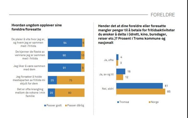 Foreldrene har full kontroll på dem. Hele 94 prosent oppgir at foreldrene vet hvem de er sammen med på fritida. Bare én av fire oppgir at de forsøker å skjule hvem de er sammen med overfor foreldrene sine. De unge har ingen etablert barne- og ungdomsverden helt for seg selv.