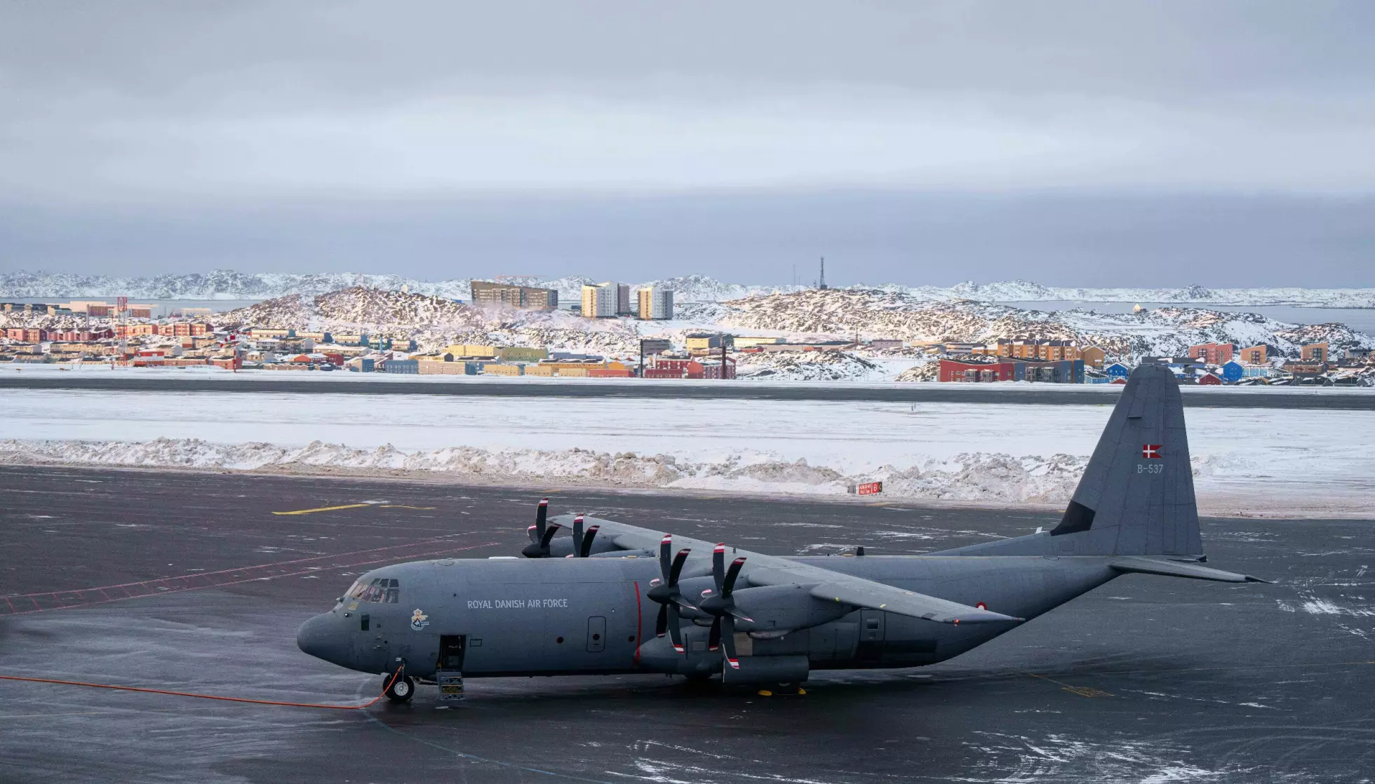 DANSK MILITÆRFLY: Danske soldater har ankommet Grønland. Natt til torsdag kom også Norges to utsendte til øya som er ønsket av USA. Foto: AP Photo / Evgeniy Maloletka / NTB