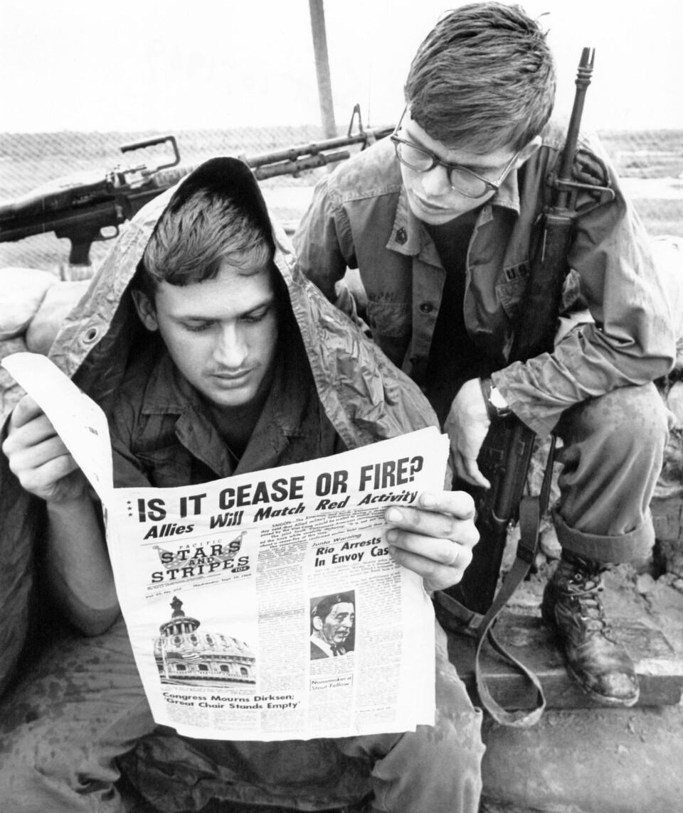 VIETNAMKRIGEN: Soldater i Vietnam fra 1969 leser Stars and Stripes-avisen, som nå står overfor store endringer. Bildet er tatt 10. september 1969.