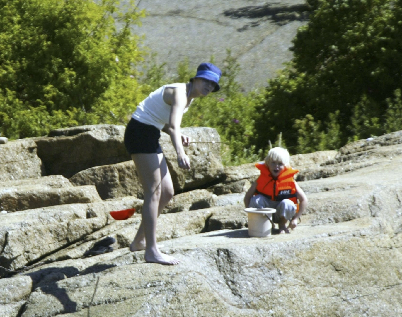 KRABBEFISKE: Kronprinsesse Mette-Marit og Marius forsøker å fange krabber nedenfor Mågerø. Slike barndomsminner varer evig. Foto: Se og Hør