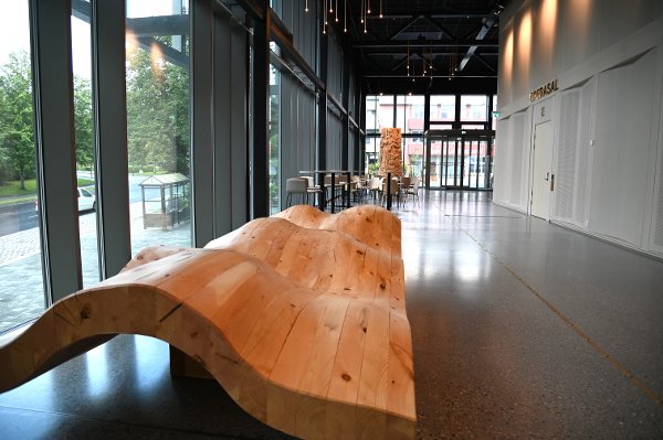 Spennende former av kunstner Erlend Leirdal bryter opp den lange gangen ved foajeen.