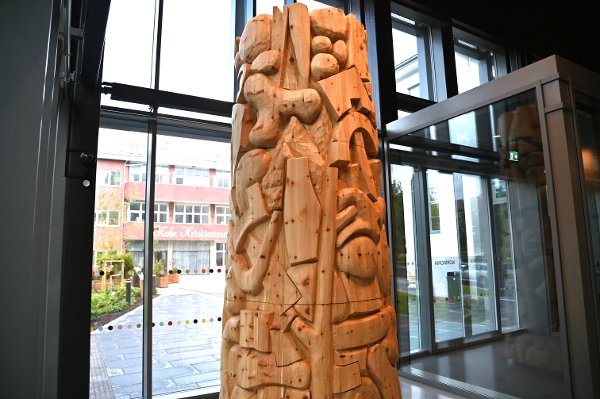 Skulpturen «Vale» av Erlend Leirdal er på plass ved foajeen.