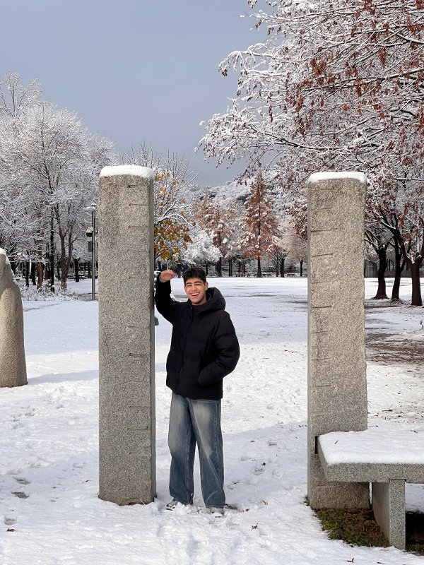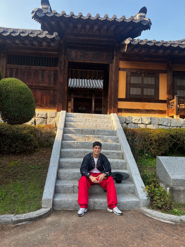 Murilo på trappen utenfor skolen Keimyung i Deagu, da han var på utveksling i Sør-Korea.