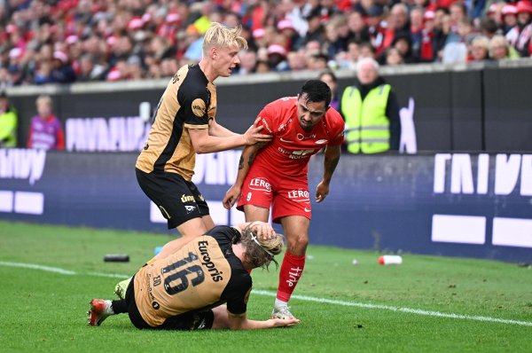 Brann – Fredrikstad 1-0: – Hvis jeg ikke hadde blødd, hadde jeg reist meg rett opp og klinket deg ned, spøker Fredrikstad-spilleren, og får et vennlig klapp på ryggen av Castro.