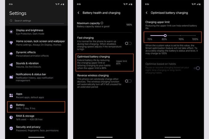 I stedet for å tviholde på full batteriprosent, anbefaler ekspertene at du holder deg mellom 20 og 80 %. Mange nyere mobiler – både iPhone og Android – lar deg sette en ladestopp på 80 %.