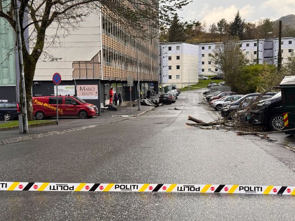 Tone Digranes var på vei til trening da hun traff på politisperringer på Mannsverk torg. Der har takplater tilsynelatende løsnet fra en blokk like ved, og landet oppå og rundt biler på en parkeringsplass.