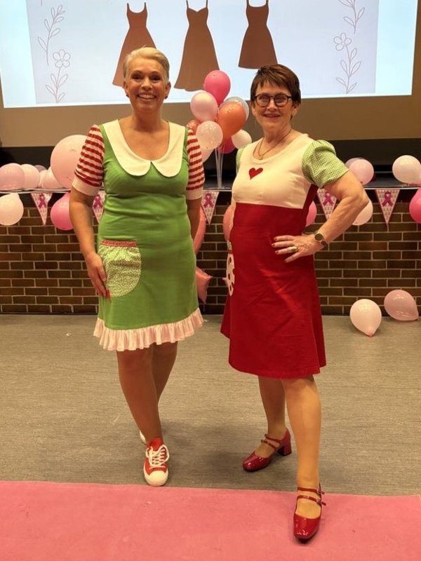 ROSA SLØYFE: Konferansier for kvelden var Anne Aarstad (t.v.) i en blå kjole, som var over 50 år gammel og har overlevd en brann. Jorunn Merete Nesvåg Øybakken (Ap) stilte i en kjole fra Palestina. Salen var pyntet med rosa ballonger og det var ingen tvil om at dette var et Rosa Sløyfe-arrangement.