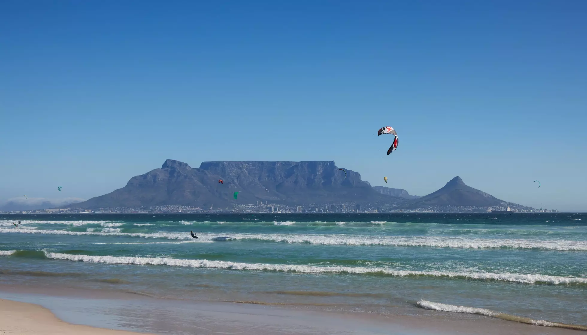 POPULÆRT: Kitesurfere i solnedgang ved Bloubergstrand i Sør-Afrika. Foto: Wirestock Creators / Shutterstock / NTB.