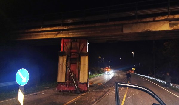 Klokken 20.22, torsdag kveld, fikk nødetatene melding om en lastebil med henger som hadde kjørt i en bru på Rafnesveien i Bamble. Det er gangbrua over fylkesveien på stedet som er truffet.