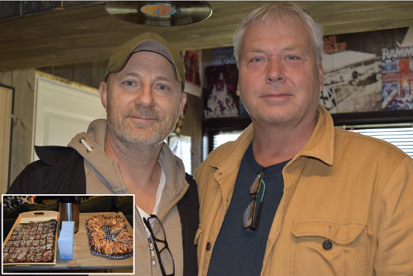 SETTER PRIS PÅ NOSTALGIEN: Barndomsvennene Petter Nilsen (t.v.) og Erik Østeby-Lindberg fra Askim og Mysen koser seg med både musikk og kake under åpningen av Spydeberg vinylklubb. – Det er en trend som nå plutselig er tilbake, sier Petter om vinylinteressen. For duoen handler det om mer enn bare lyd, platene vekker minner. – Når man setter på en plate, tenker man tilbake på da man var ung igjen. Det er både nostalgi og samling i ett, forteller Erik. De roser også det lokale initiativet. – Dette er et veldig fint tiltak for lokalsamfunnet, og her trekker alt, til og med gode kaker, smiler Erik.